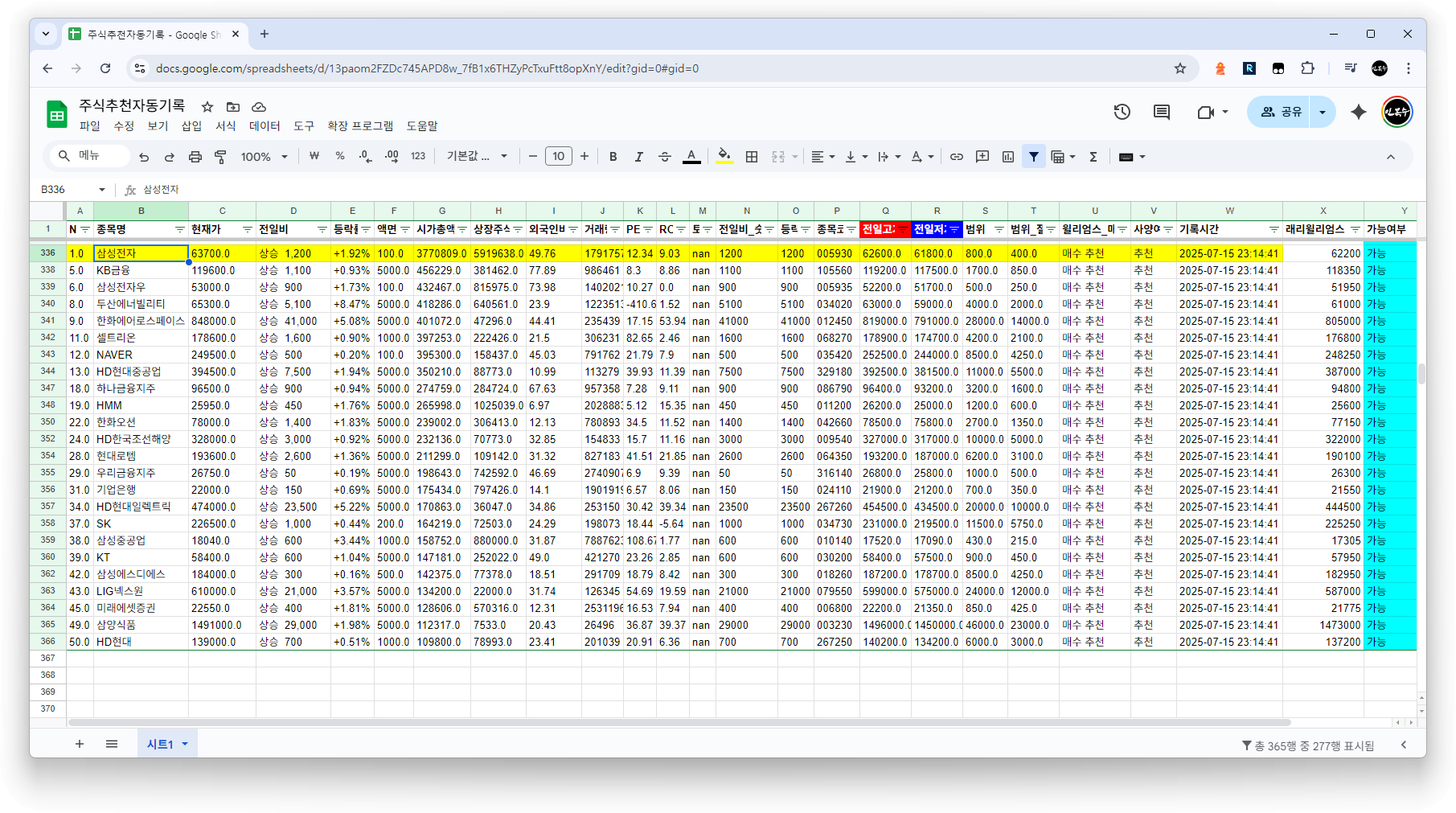 - ‘윌리엄스_매수’ 컬럼 값이 ‘매수 추천’인 종목만 최종 필터링